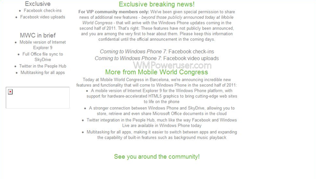The next Windows Phone update, codenamed Mango, just seems to be getting better and better. WMPoweruser is reporting that the Mango will bring the ability to upload videos to Facebook and check-in using Facebook places. It seems the VIP members have known this since MWC earlier this year.
