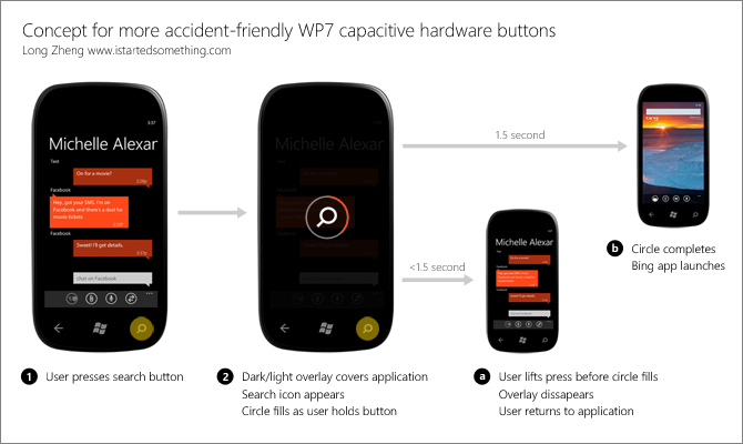 Long Zheng has come up with a simple idea on how this this can be solved. If you keep the capacitive button pressed for more than a specified time (the circle keeps getting filled meanwhile) , the Bing app launches otherwise you return to whatever you were doing. This design is similar to the one found in the MetroTwit app. Zheng would have liked to do the same for the 'back' button but that action is used for multi-tasking in Mango.