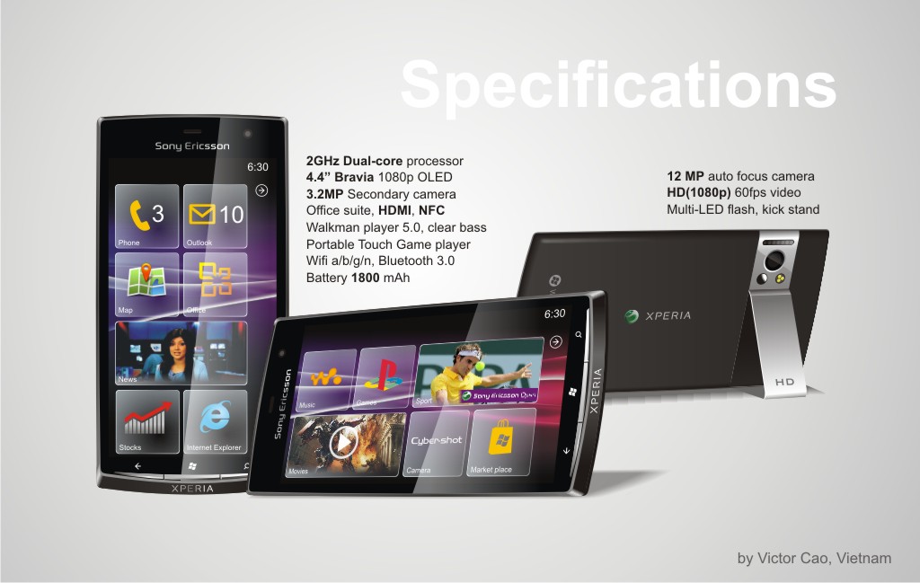 Mango isn't even out yet and Windows Phone 8 concepts are already surfacing. Can you feel the excitement ? Victor Cao has created a futuristic, droolworthy concept phone based on a future imagined version of Windows Phone. It uses a future version of Office and is equipped with the Transolid UI.Its aimed as a high-end device with a dual core 2 GHz processor, 12 MP back camera , 3.2 MP front camera, an 1800 mAh battery, a 4.4 inch 1080p OLED touchscreen, wireless HDMI and NFC support. The 12 MP autofocus Cybershot camera has multi-LED flash, the screen is Bravia, has a Walkman music player and the phone is Playstation certified as well. Talk about dream phones, eh ? More images below.